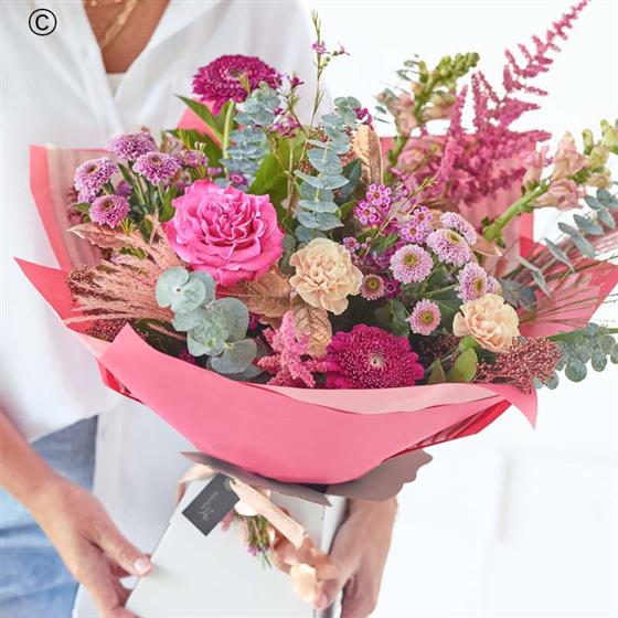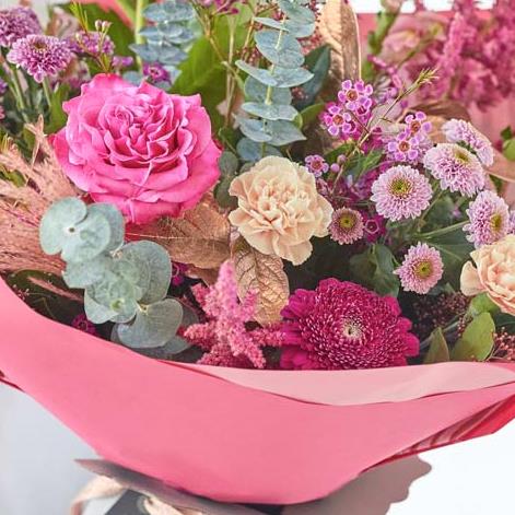 A beautiful bouquet handcrafted by their local florist featuring blooms in cerise and purple tones, with soft pink, peach or lilac shades. It might also feature dried flowers or foliage painted in copper or rose gold.