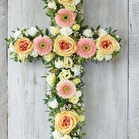 A cross of pretty pastels including peach roses and germini, white carnations and cream lisianthus.
