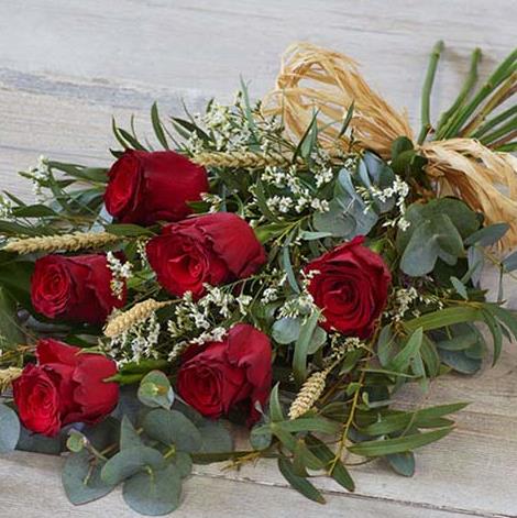 Gorgeous roses and eucalyptus beautifully combined with natural elements including dried wheat and a raffia bow.