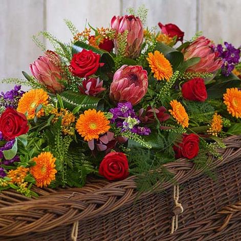 A fragrant spray of vibrant tropical tones and blooms including protea, stocks and germini.